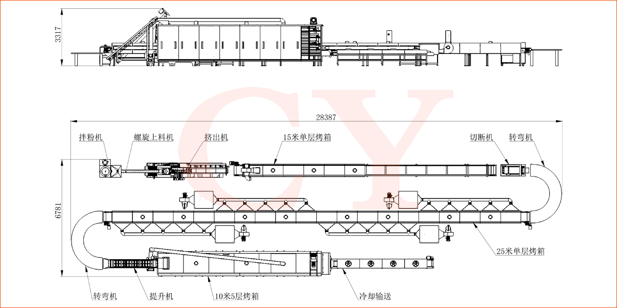原料混合-擠壓熟化-定型干燥-切斷-一次干燥-二次干燥--冷卻-包裝